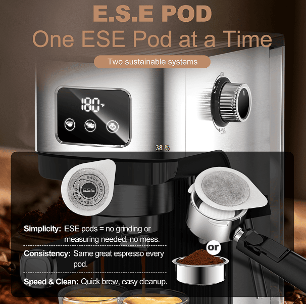 Easy ESE POD Brewing-Our machine features filters specially designed for ESE POD espresso capsules to make the brewing process easy and enjoyable. Embrace the convenience of ESE POD and get constant and delicious coffee every time.
