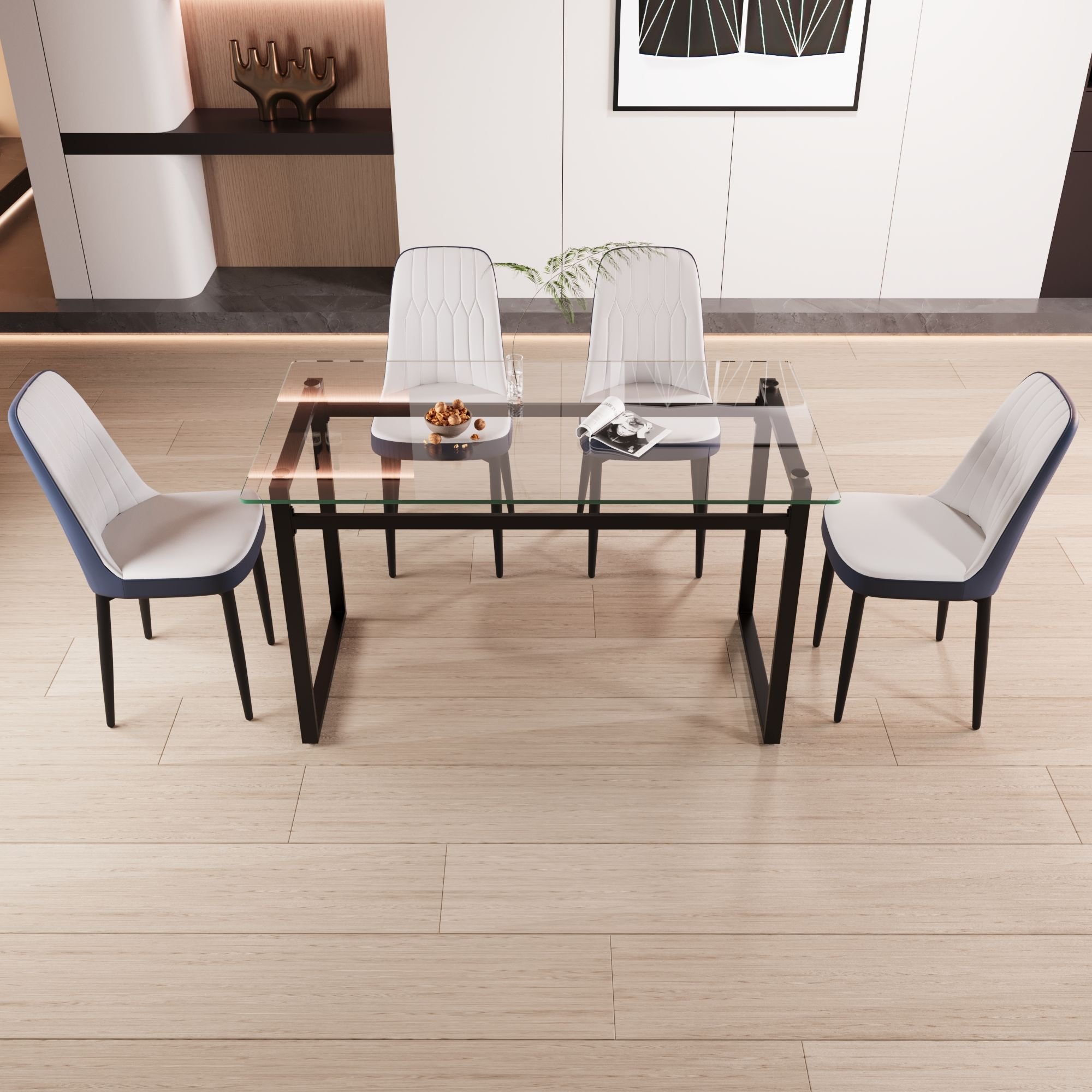 • 7.[Modern dining table set] This 5-piece kitchen table set includes a modern square glass dining table and 4 high-quality PU upholstered dining chairs. The modern industrial design of the dining table and chairs features clean lines that blend well into a variety of decorative styles. the spacious 51" square tabletop is spacious enough to easily accommodate 4 people in a small apartment.