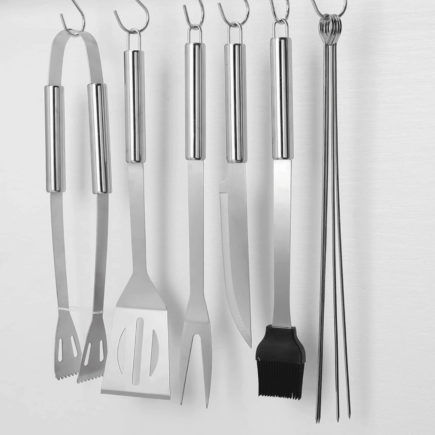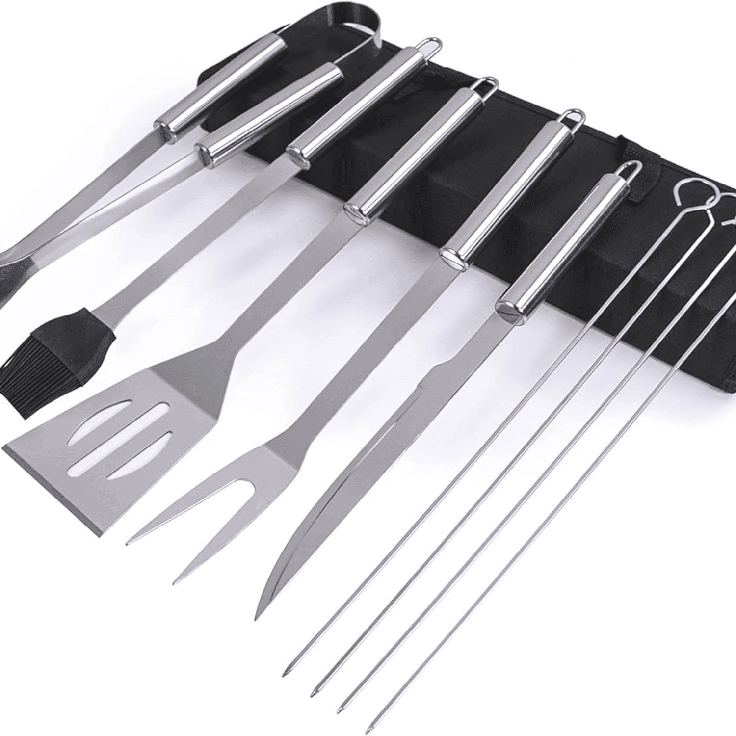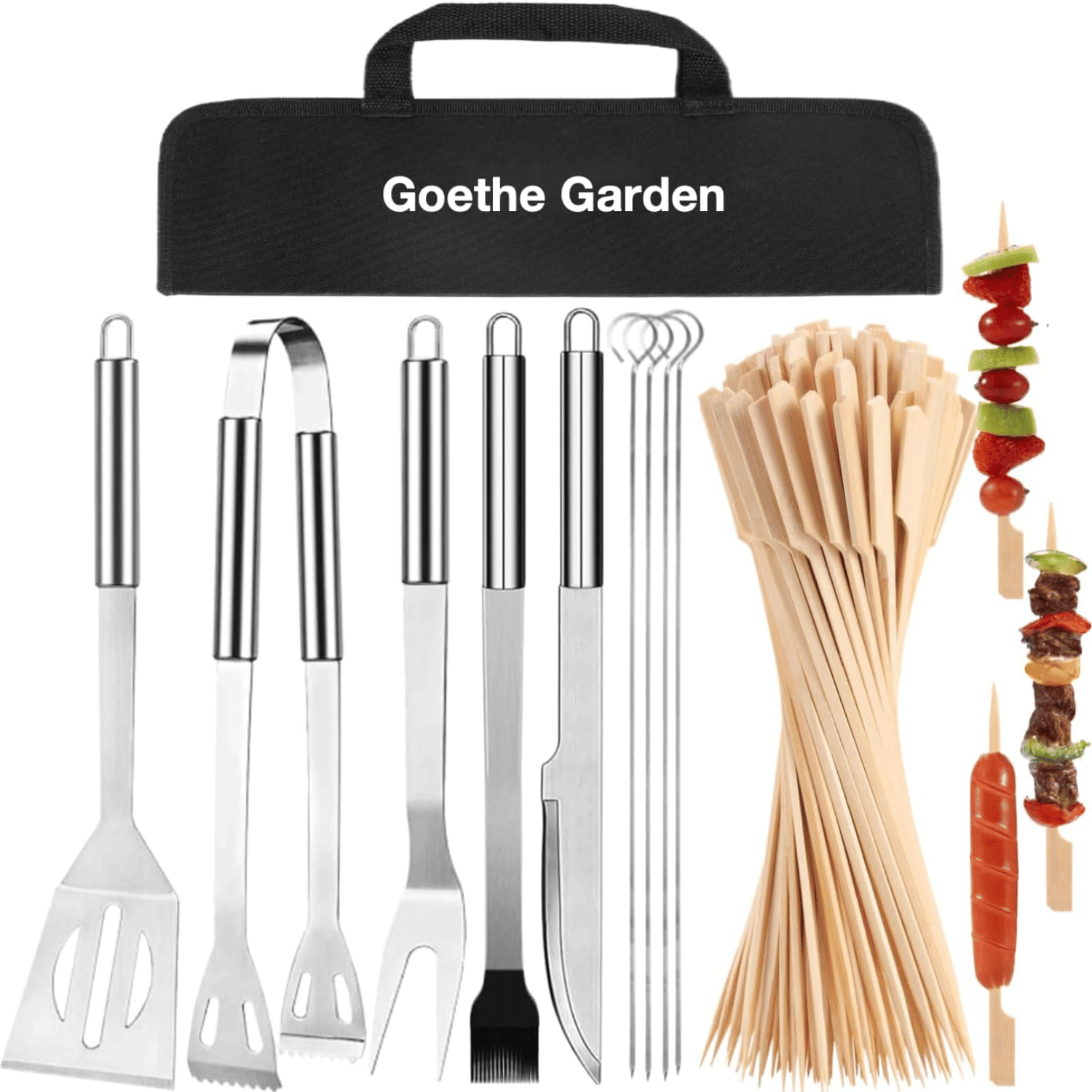 [Practical & professional Grill Set]: The grilling utensil set is professionally equipped with all the essentials to take your barbecue game to the next level and have you grilling like the pros. This grill accessories set includes grill fork, barbecue spatula, BBQ tongs, basting brush, knife, 4 skewers and a convenient storage bag for keep all heavy duty bbq accessories stays in order and protected with life-long lasting. [Durable & Exceptional Quality]: The grill kit is made of extra thick stainless steel, so there is no worry about the grilling accessories become breaking or bending. And this grill utensils set is constructed with stainless steel , you'll be amazed how sturdy and comfortable each bbq set grilling tool feels in your hand. Portable Barbecue Bag]: Grill accessories are packed in a portable and durable cloth bag, which is lighter than aluminum grill box and not easy to break and be out of shape during transportation. And elastic band in cloth bag can easily fix grill accessories. Make them in order, you can pick it up easily when open the bag. [Ideal Gift Set]: Goethe Garden grill tools set is an ideal gift for Father's Day, birthday, Halloween, Thanksgiving Day, Christmas,etc. It’s operated easily and very friendly both for newbies and master. Also a perfect option for organizing beach parties and camping barbecues. [About Goethe Garden]: The utmost care in quality and dependability were taken to produce our barbecue tool sets. Because we not only aim to offer every premium product, but also stand by the satisfaction of our customers. Also, all of our grill sets are strictly inspected before we ship them out to you. If you not satisfied with our product for any reason, please contact us, we will take care of it in time.