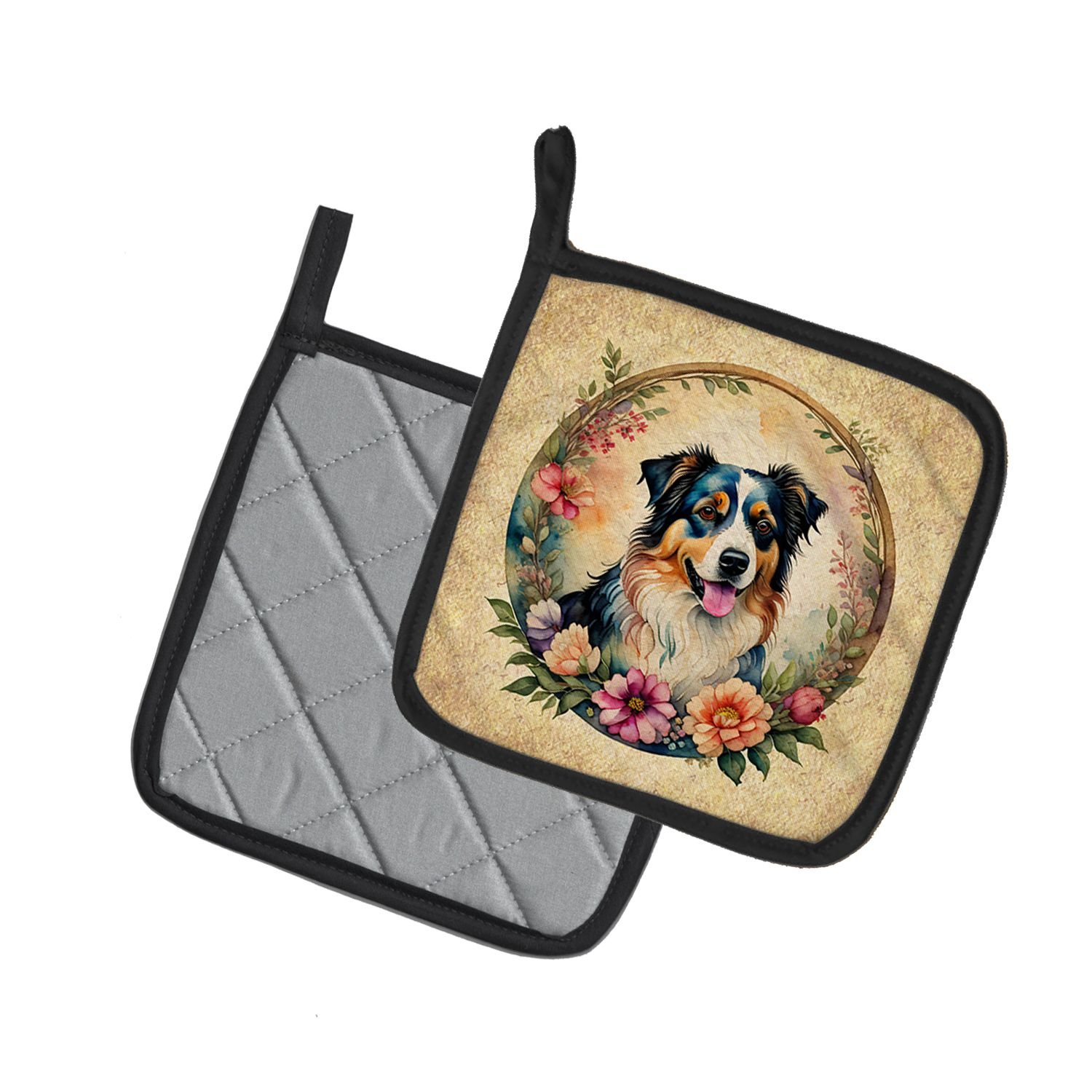 Australian Shepherd and Flowers Pair of Pot Holders Kitchen Heat Resistant Pot Holders Sets Oven Hot Pads for Cooking Baking BBQ, 7 1/2 x 7 1/2