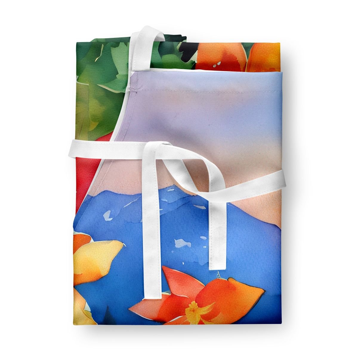 Apron featuring breed specific Colorado Rocky Mountain Columbine artwork. Elevate your cooking, baking, and grilling experiences with our versatile Kitchen or BBQ Apron. This Bib Style apron isn't just limited to culinary activities - it also serves as an excellent baking apron, artist apron, server apron, gardening apron, or even a dog grooming apron. The apron showcases vibrant full-color artwork contributed by one of our talented artists, bringing a dash of style to your daily tasks. With dimensions of approximately 27"W x 30"H, it provides ample coverage to protect your clothing from spills and splashes. Our apron is meticulously crafted from 100% Ultra Spun Polyester, known for its durability and lightweight nature. The apron comes with white tie straps, ensuring a comfortable and adjustable fit for all. It's a perfect choice for kitchen apron enthusiasts, whether you are a woman or a man. Designed for easy maintenance, this apron is fully machine washable. The quick-drying polyester material actively reduces staining, keeping your apron looking fresh and new for longer. Our beautifully designed apron isn't just a functional kitchen accessory - it's a fashion statement in the culinary world!