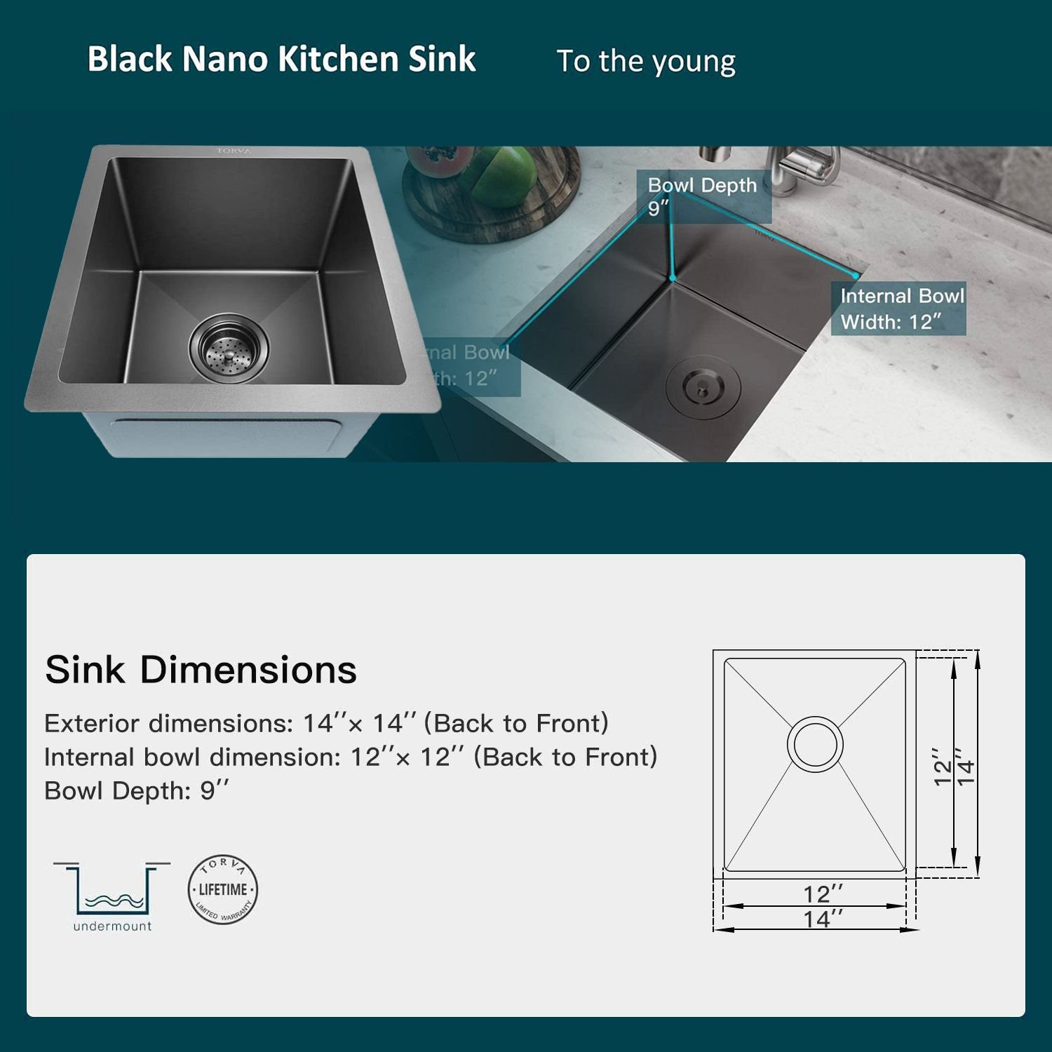 Gloss Black Ceramic Coating with NanoTek Undermount Kitchen Sink;  16 Gauge T-304 Stainless Steel Single Bowl Wet Bar or Prep Sink Gloss Black Ceramic Coating with NanoTek Undermount Kitchen Sink;  16 Gauge T-304 Stainless Steel Single Bowl Wet Bar or Prep Sink Gloss Black Ceramic Coating with NanoTek Undermount Kitchen Sink;  16 Gauge T-304 Stainless Steel Single Bowl Wet Bar or Prep Sink