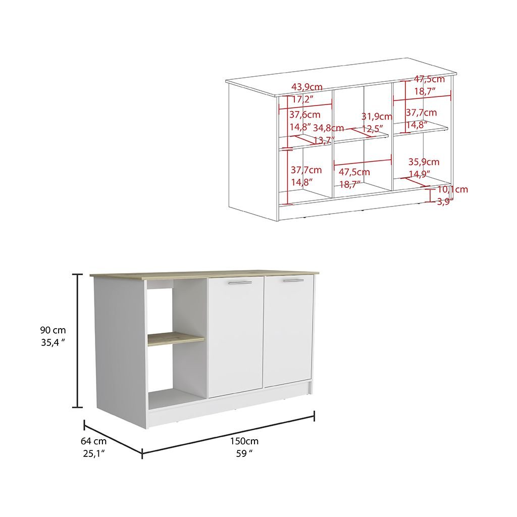 Juniper Kitchen Island, Four Open Shelves, Two Cabinets -Light Oak / White