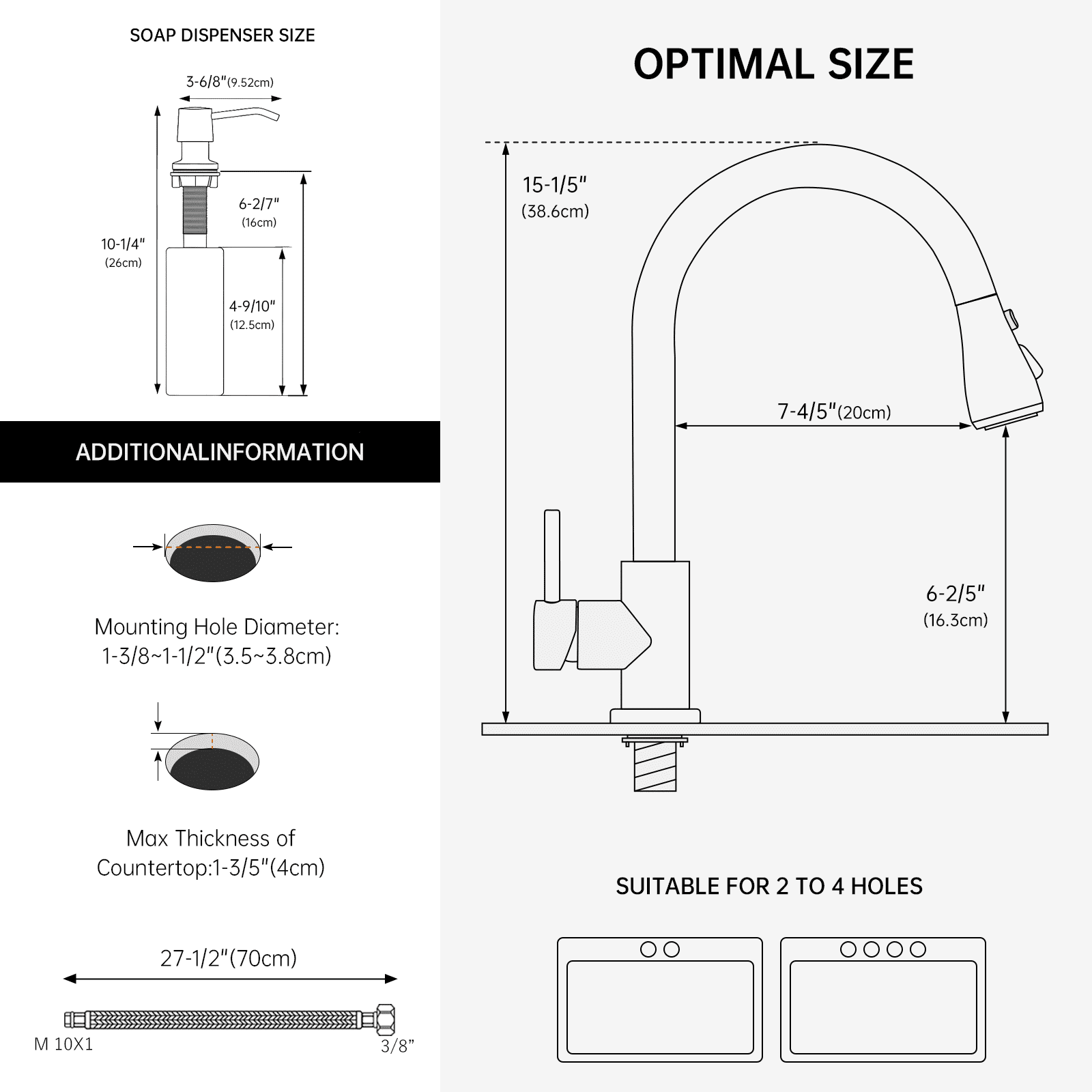 1.The Best Kitchen Partner: Faucet and soap dispenser with an 20” pull out hose, can reach even deep corner for cleaning. 360°rotation swivel nozzle offers full range washing access, bringing more convenience during your everyday kitchen tasks