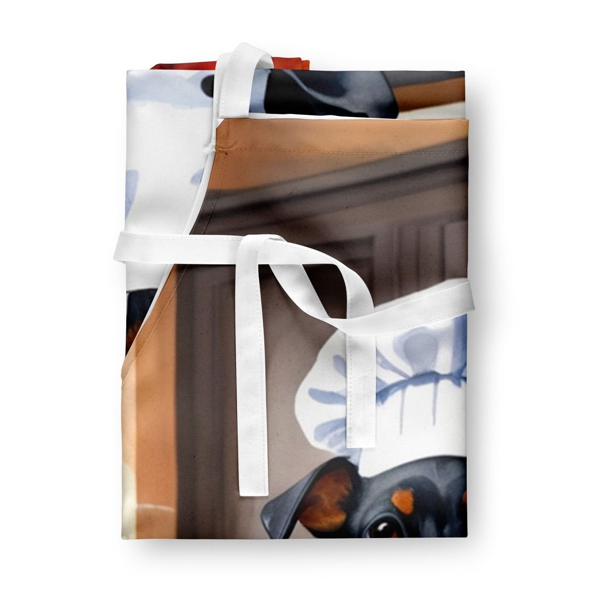 Apron featuring breed specific Manchester Terrier artwork. Elevate your cooking, baking, and grilling experiences with our versatile Kitchen or BBQ Apron. This Bib Style apron isn't just limited to culinary activities - it also serves as an excellent baking apron, artist apron, server apron, gardening apron, or even a dog grooming apron. The apron showcases vibrant full-color artwork contributed by one of our talented artists, bringing a dash of style to your daily tasks. With dimensions of approximately 27"W x 30"H, it provides ample coverage to protect your clothing from spills and splashes. Our apron is meticulously crafted from 100% Ultra Spun Polyester, known for its durability and lightweight nature. The apron comes with white tie straps, ensuring a comfortable and adjustable fit for all. It's a perfect choice for kitchen apron enthusiasts, whether you are a woman or a man. Designed for easy maintenance, this apron is fully machine washable. The quick-drying polyester material actively reduces staining, keeping your apron looking fresh and new for longer. Our beautifully designed apron isn't just a functional kitchen accessory - it's a fashion statement in the culinary world!