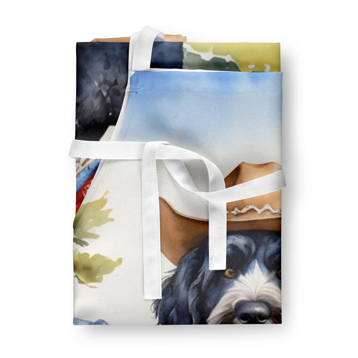 Apron featuring breed specific Portuguese Water Dog artwork. Elevate your cooking, baking, and grilling experiences with our versatile Kitchen or BBQ Apron. This Bib Style apron isn't just limited to culinary activities - it also serves as an excellent baking apron, artist apron, server apron, gardening apron, or even a dog grooming apron. The apron showcases vibrant full-color artwork contributed by one of our talented artists, bringing a dash of style to your daily tasks. With dimensions of approximately 27"W x 30"H, it provides ample coverage to protect your clothing from spills and splashes. Our apron is meticulously crafted from 100% Ultra Spun Polyester, known for its durability and lightweight nature. The apron comes with white tie straps, ensuring a comfortable and adjustable fit for all. It's a perfect choice for kitchen apron enthusiasts, whether you are a woman or a man. Designed for easy maintenance, this apron is fully machine washable. The quick-drying polyester material actively reduces staining, keeping your apron looking fresh and new for longer. Our beautifully designed apron isn't just a functional kitchen accessory - it's a fashion statement in the culinary world!