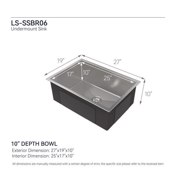 27 INCH WORKSTATION KITCHEN SINK: 27" (wide) x 19" (length) x 10" (depth). The drop-in kitchen sink's exterior design ensures a modern and elegant aesthetic while maximizing the available space to accommodate large dishes pots and pans.