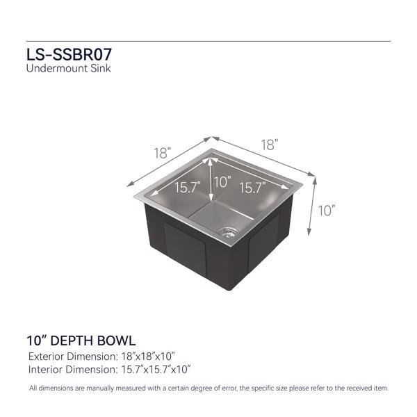18 INCH WORKSTATION KITCHEN SINK: 18" (wide) x 18" (length) x 10" (depth). The drop-in kitchen sink's exterior design ensures a modern and elegant aesthetic while maximizing the available space to accommodate large dishes pots and pans.