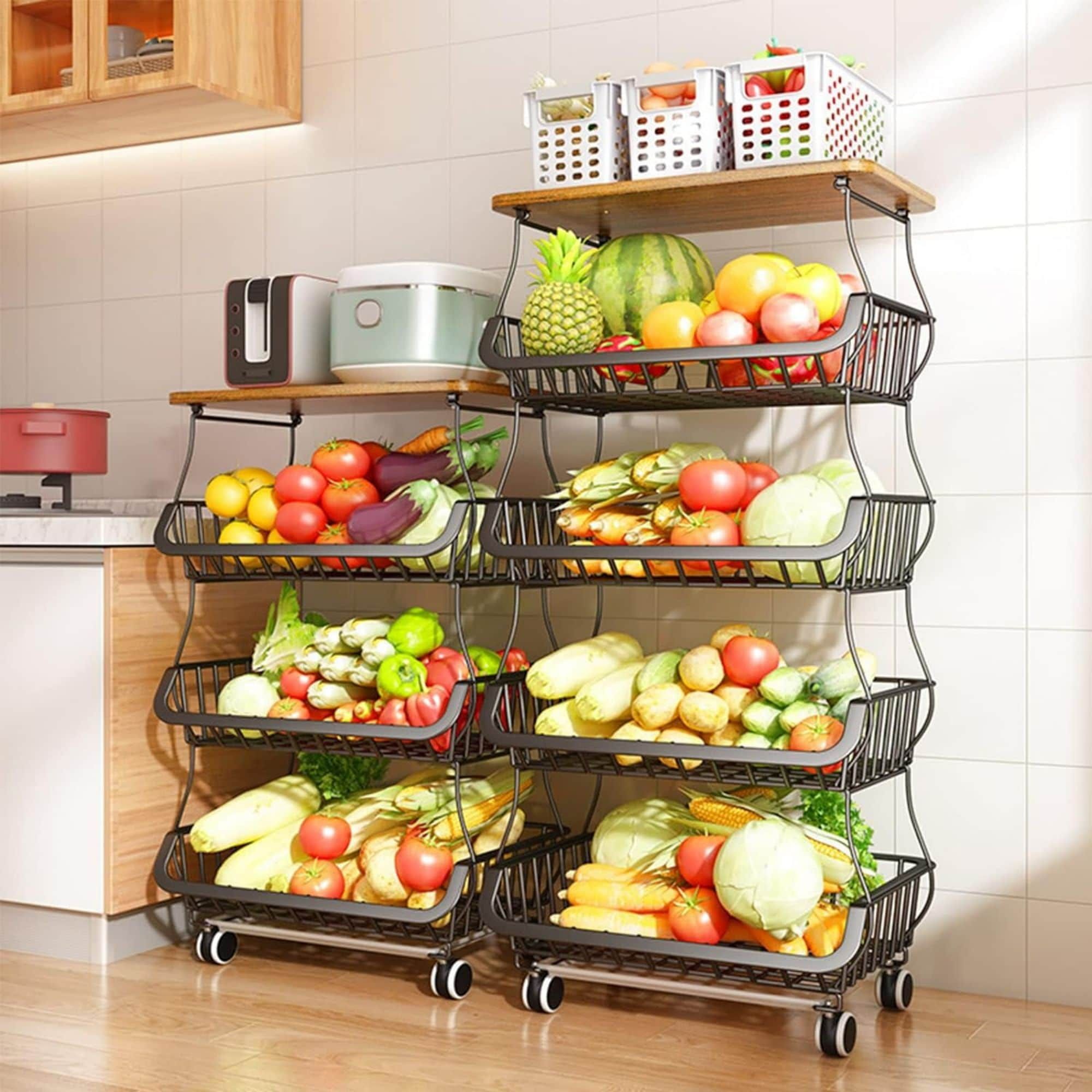 5 Tier Fruit Basket for Kitchen Organizers and Storage, Stackable Metal Wire Basket Stand Cart with Wheels for Fruit Vegetable