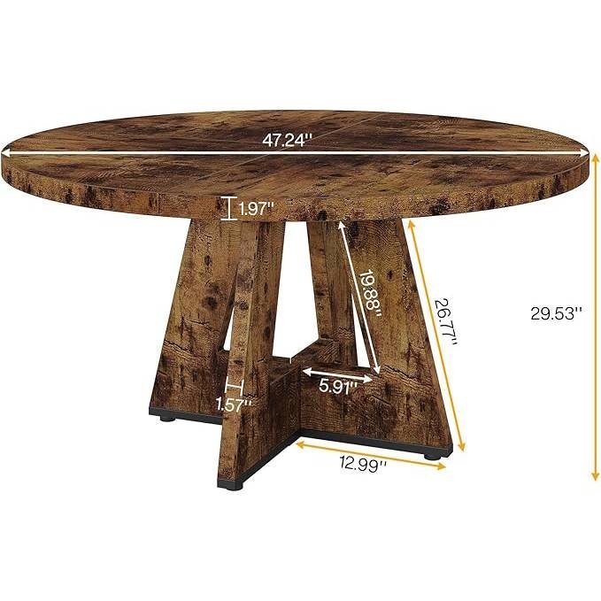 This Farmhouse Rustic Brown Round 47-in Wooden Kitchen Table exhibits a charming farmhouse look and warm retro brown color, adding rustic elegance to any room. With its spacious 47-inch tabletop, this round dining table comfortably seats 4 people, perfect for dinner parties or family meals. Built from high-quality thick MDF, this table is durable, waterproof, scratch-proof, and easy to clean, promising long-lasting usability. In addition to dining, this table can serve as a study or work table or as a striking centerpiece in your living room, showcasing its versatile design. Comes with clear instructions and necessary hardware, this table is easy to assemble. We are here to assist with any queries about the rustic round dining table.