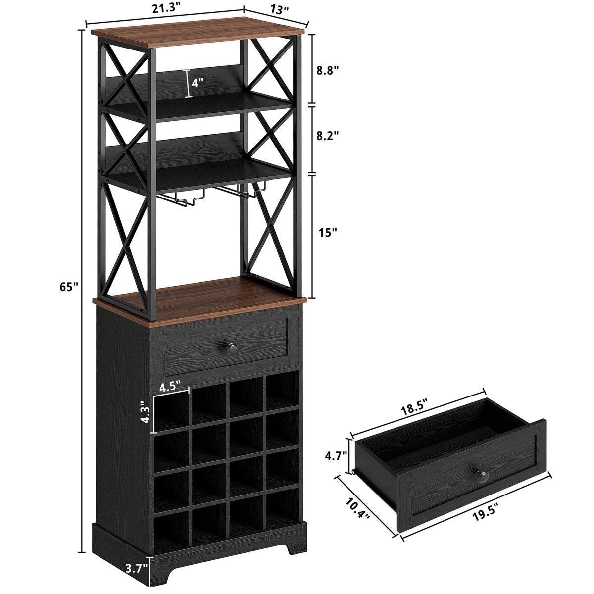 Maximize your space with this industrial-style freestanding wine rack! Designed for small spaces, this wood tall wine cabinet stores 16 wine bottles, 6 glasses, and features a drawer plus 3-tier shelves for coffee beans or beverages. The spacious tabletop doubles as a serving station, while the durable metal frame and MDF board ensure long-lasting use. Perfect for home bars,mini bars, or compact areas!