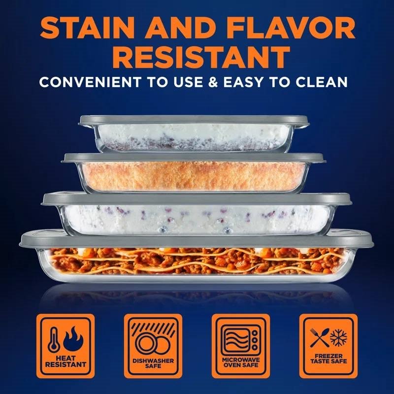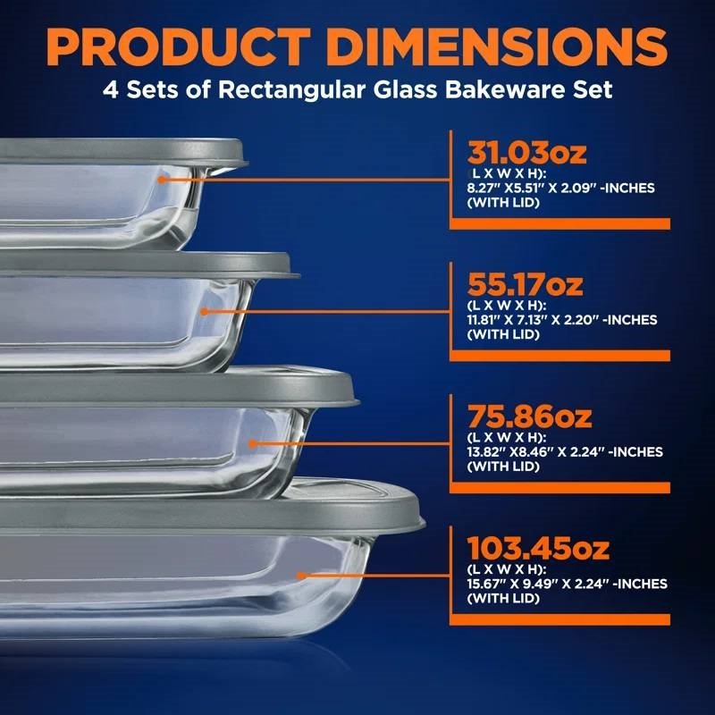 This Set of 4 - Rectangular Oven Safe Glass Bakeware Set with Grey Plastic Lids is a high borosilicate rectangular glass baking dish w/ gray bpa-free pe lids, freezer-to-oven home kitchen bake casserole food storage stackable tray pan, dishwasher safe. The 8-piece bakeware set offers a complete high-quality cooking or baking dish for casseroles, lasagna, or storing leftovers. Includes 0.9-quart, 1.72-quart, 2.4-quart & 3.2-quart capacity baking dishes with 4 BPA-free lids. Made from high borosilicate glass which is more resistant to thermal shock than other types of glass, it is also chemical-resistant & acid degradation making it the safest choice for your cooking and baking needs. Heat-safe even at high temperatures of up to 968‚àûf which is ideal for baking several tasty baked goods or pastries. Make the most delicious chocolate fudge, cookies, brownies, and casseroles, and can also be used as a serving tray. The commercial-grade restaurant quality kitchen bakeware features a non-slip design to prevent kitchen accidents. Also stain-resistant, easy to clean & dishwasher safe but hand washing is recommended to extend pan life. The reusable professional baking set features a space-saving stackable wide tray pan design for convenient storage. It is fully compatible with standard & convection ovens. Suitable for oven, microwave, refrigerator & freezer.