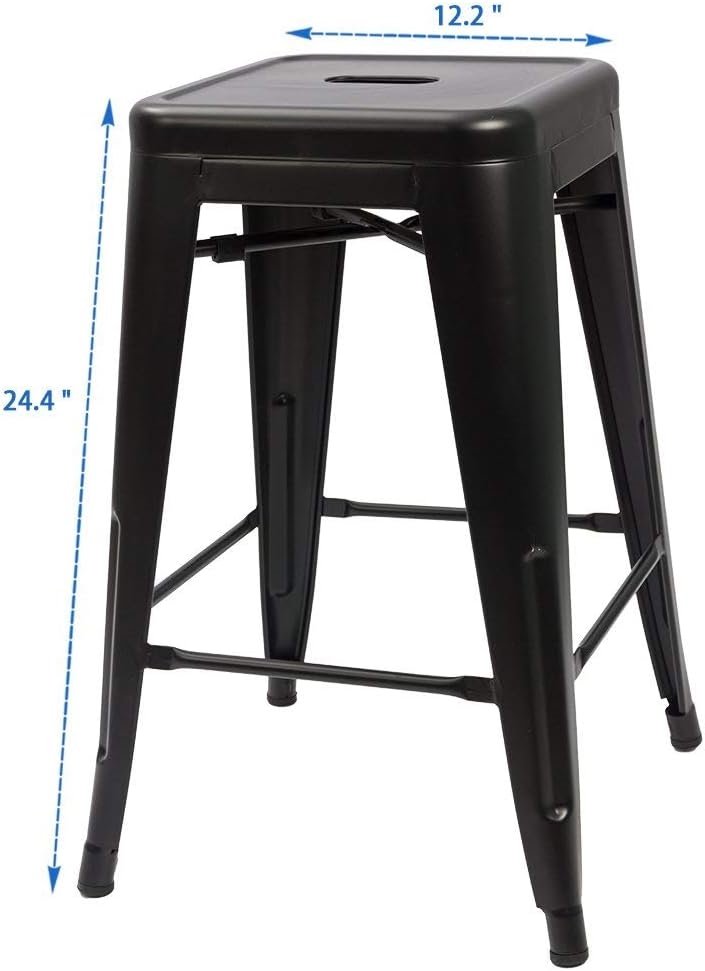 This Set of 4 - 24-in. Indoor/Outdoor Backless Stacking Black Metal Barstools for convenient storage & space saving use hand-holds make the stools easily to be picked up or moved each lightweight but sturdy stool weighs 11 lbs, while with 330 lbs weight capacity x-brace support under the seat provides additional stability & durability non-mar rubber feet prevent from sliding and scratching floors heavy duty metal construction each metal bar stools 30'' tall, seat size 12 x 12''.