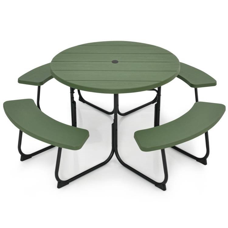 The 43" round table Green All Weather 8 Seater Picnic Table Umbrella Hole can comfortably seat up to 8 adults. Whether you're hosting a barbecue or enjoying an outdoor meal, the picnic table provides the perfect gathering place for your family and friends. The selected HDPE material exhibits excellent resistance to cracking and fading, ensuring its durability and making it a dependable choice for long-lasting outdoor use. The picnic table bench set is supported by a powder-coated metal frame and has excellent rust resistance and stability. The u-shaped legs and reinforced x-structure provide reliable support. Besides, there exist non-slip protectors to avoid scratching to the floor. Featuring a 1.9" hole, the round picnic table set allows you to install a patio umbrella. Hence, you can create a shaded area to enjoy a delightful meal without harsh sunshine. With the wood-like appearance and enhanced durability, the outdoor picnic table blends seamlessly with any outdoor setting, such as your yard, lawn, poolside, or garden.
