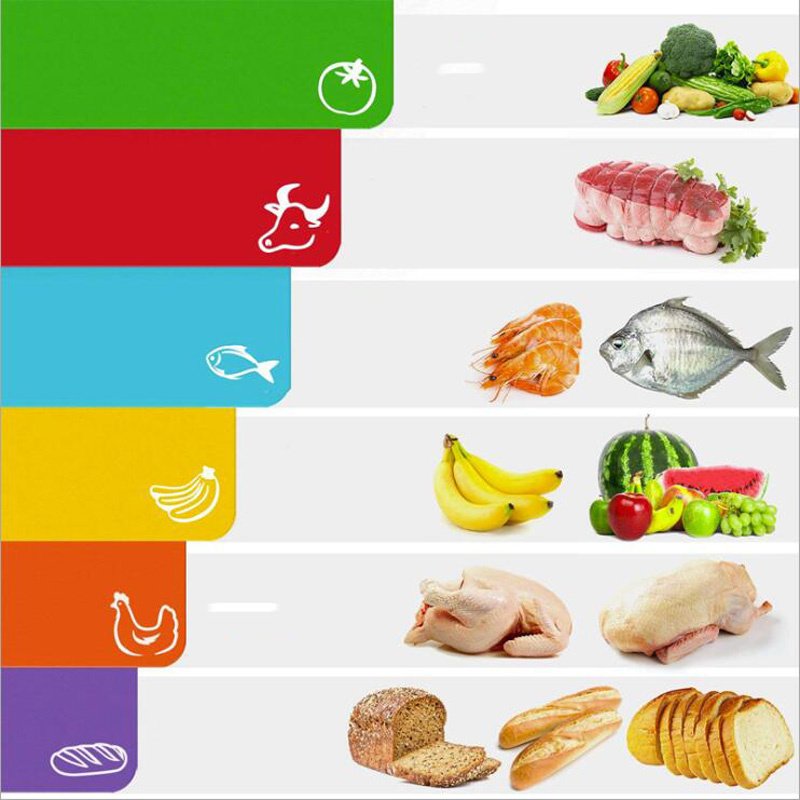 1.PREVENT CROSS-CONTAMINATION --- Set of 6 Color coded plastic cutting board sheets. 6 colorful food icons for different food items including fish, meat, vegetables, fruits, dessert and ingredients. Perfectly avoids cross-contamination and gives your family healthier meals everyday.Made of premium qua
