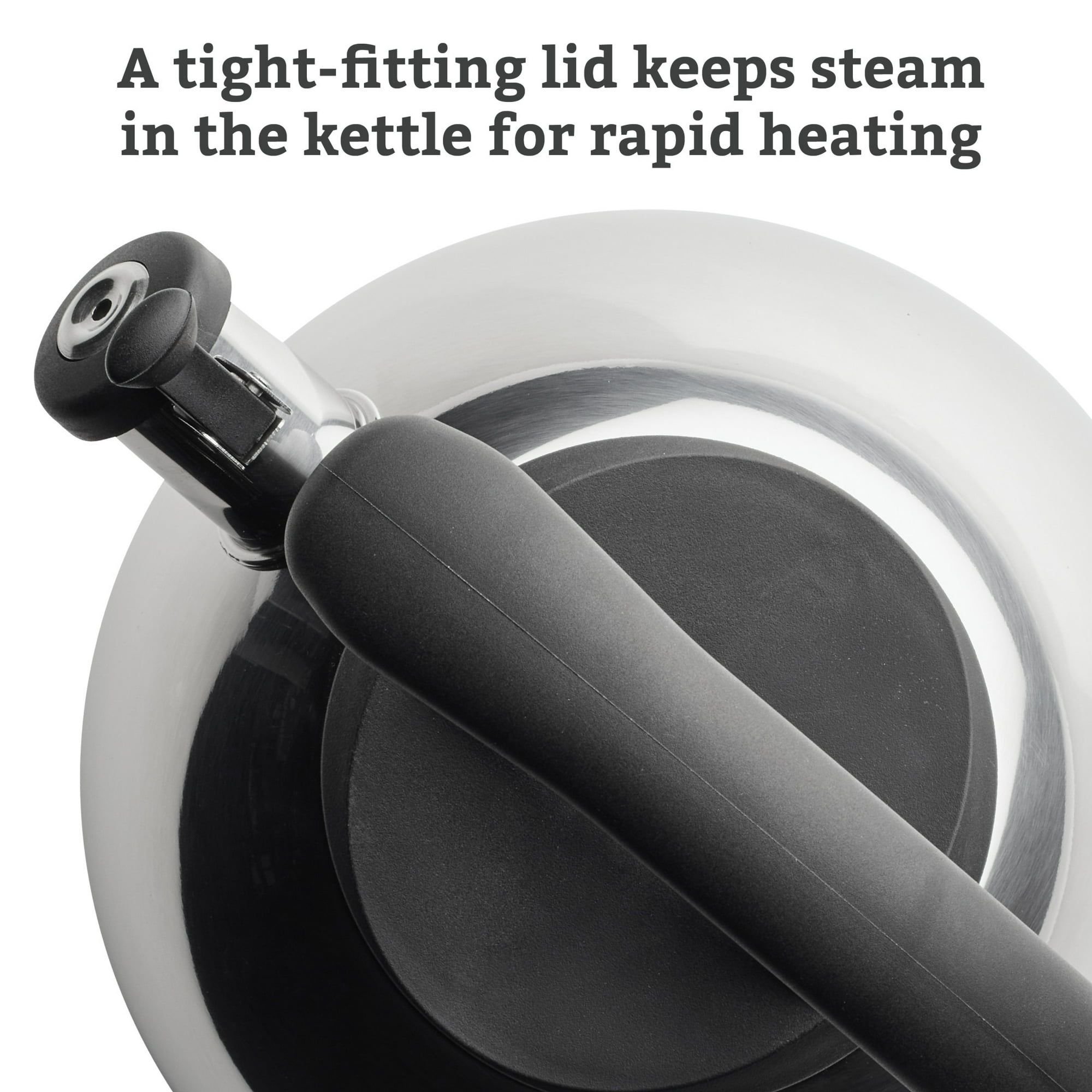 Durable Construction: Crafted from polished stainless steel, this whistling kettle offers durability and complements various kitchen decors.Effortless Pouring: Features a convenient flip-up, lock-open spout cap for easy and controlled pouring of hot water.Rapid Heating: A tight-fitting lid effectively keeps steam within the kettle, facilitating quick water heating.Audible Alert: The kettle emits a pleasant whistle when the water reaches its boiling point, signaling readiness.Comfortable Handling: Designed with a comfortable handle that provides a balanced and secure grip during pouring.