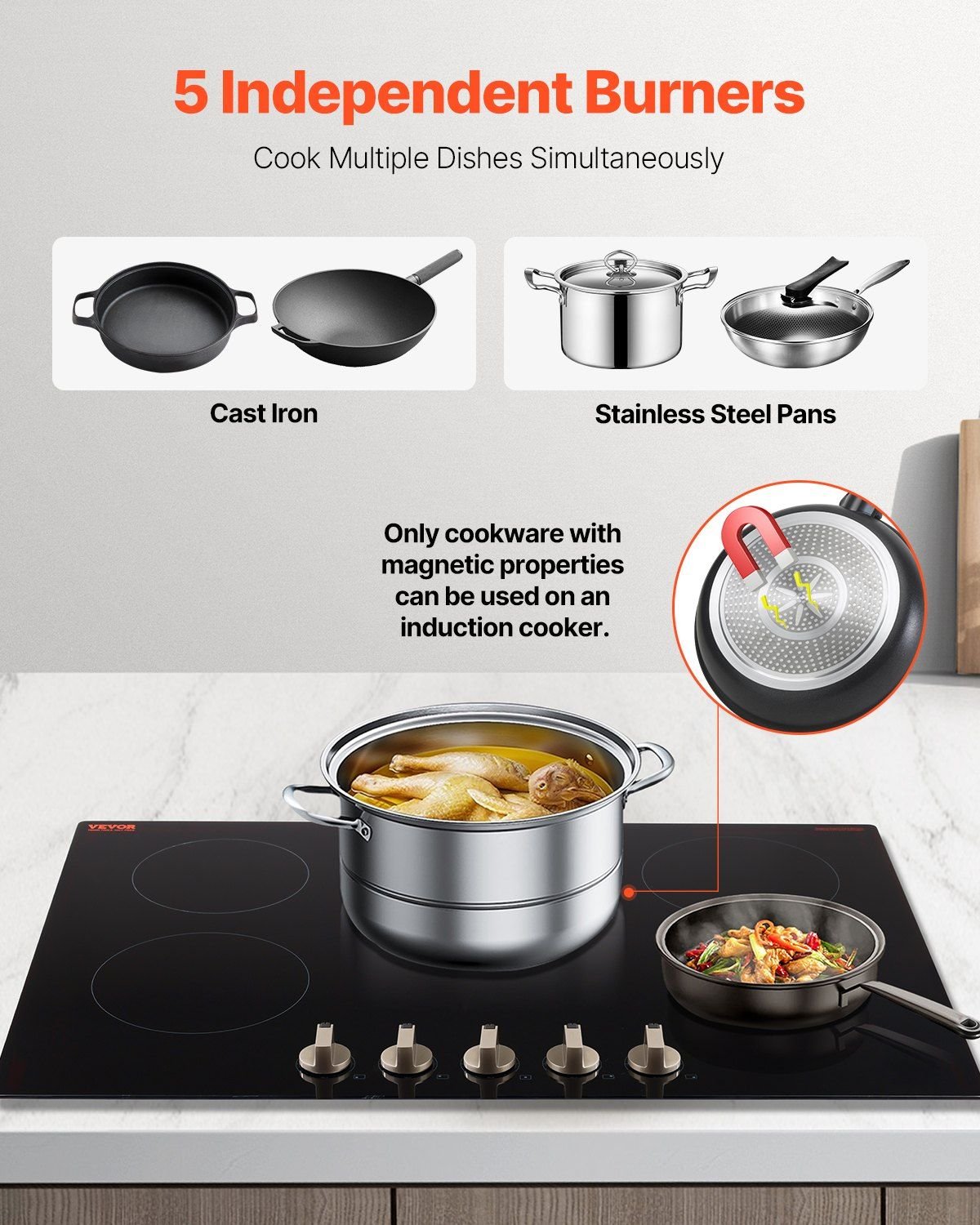 Knob controls make the electric countertop burner easy to operate. Each knob can independently control the temperature. The 5 cooking zones provide a more efficient cooking experience and are compatible with a variety of heat-resistant cookware, reducing energy loss.