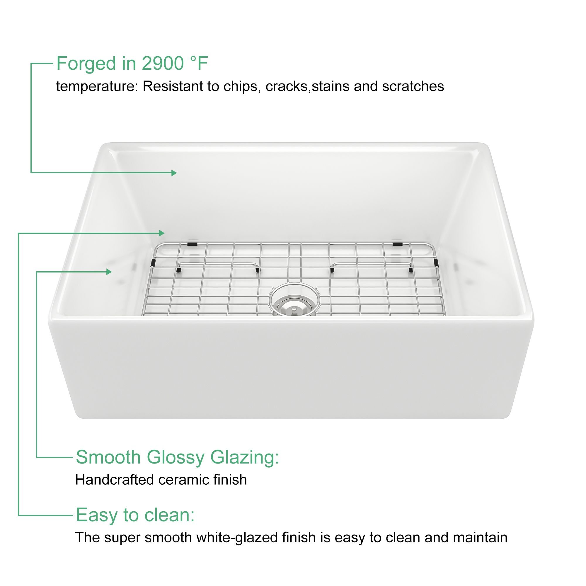 2.The single bowl farm sink after more than 1200°C high temperature calcination, the water absorption rate of the product is less than 0.2%, reaching the standard of vitrified porcelain.